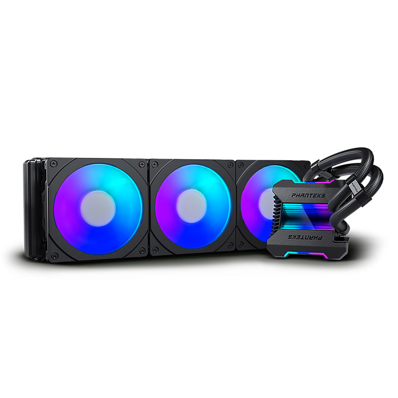 Das optische Highlight der Kühlung ist der Deckel der Kühler-Pumpen-Kombi sowie die bis zu drei Halo D-RGB-Lüfterrahmen. In Verbindung mit den insgesamt 14 digital adressierbaren RGB-LEDs entstehen so beeindruckende Effekte. Die schwarzen D-RGB-Lüfterrahmen lassen die Rotorblätter der Lüfter erstrahlen und besitzen jeweils 30 RGB-LEDs. Die Beleuchtung lässt sich mit einem PHANTEKS-RGB-Controller oder mit der Software eines kompatiblen Mainboards steuern. Der stylishe Deckel ist magnetisch am Pumpengehäuse befestigt und trägt ebenfalls zum cleanen Look bei.